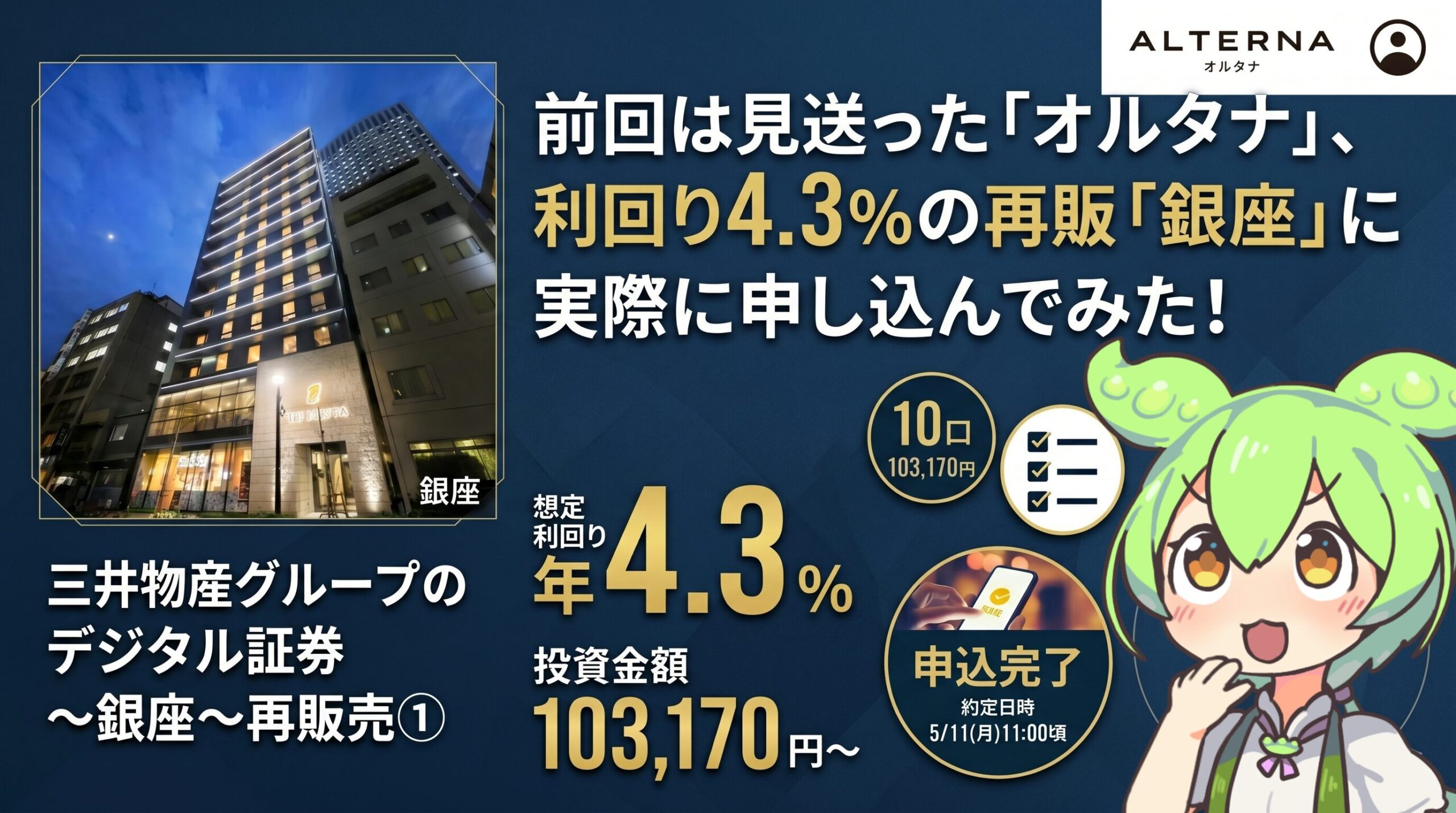 今回は、前回投資を見送った疑り深い私が、オルタナの再販売でついに納得できる「銀座」のデジタル証券に申し込んでみた様子をお届けしました。