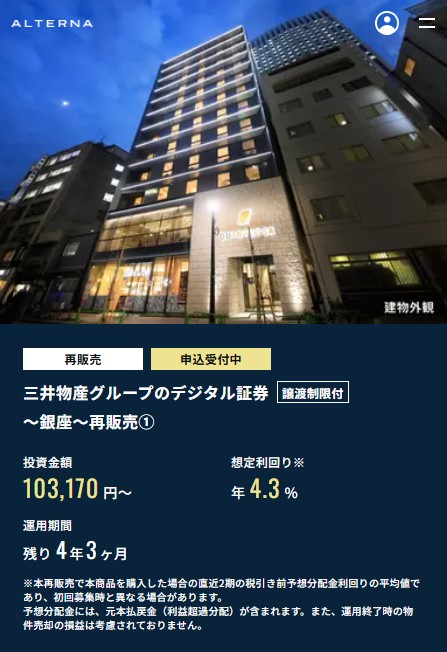 | 譲渡制限付 〜銀座〜再販売① | 103,170円 | 4.3% |