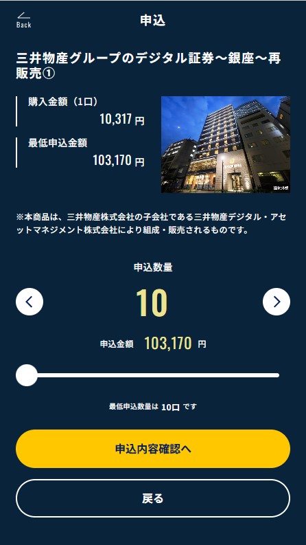 次に、購入したい口数を入力します。この物件は「最低申込数量が10口(103,170円)から」となっているので、今回は10口を入力しました。数量が決まったら「申込内容確認へ」ボタンをタップします。