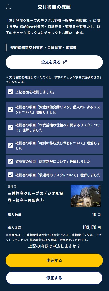 「契約締結前交付書面」や「目論見書」などの重要な書面を確認します。投資のリスクなども書かれているので、しっかりと目を光らせて読みましょう。すべての項目を確認したら、チェックボックスにチェックを入れて「申込する」ボタンをタップします。