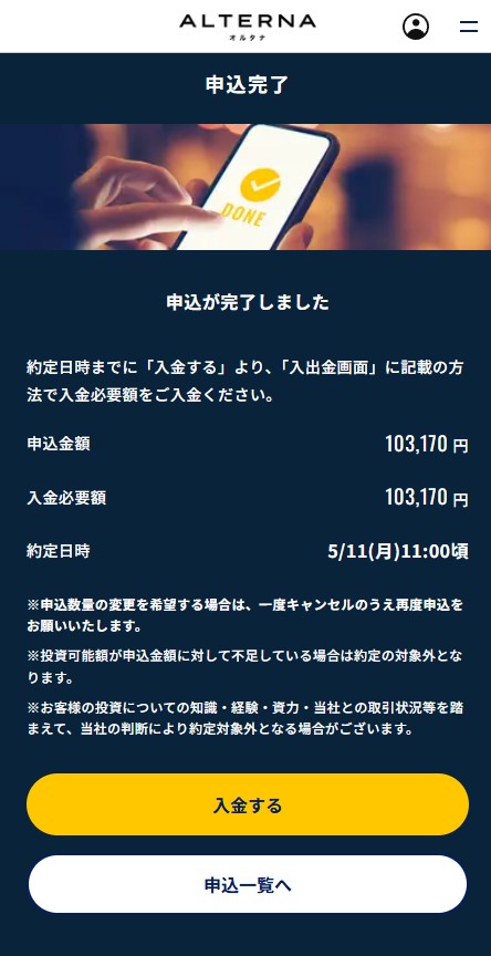 完了画面には表示されていますが、これで終わりではありません。指定された入金必要額をオルタナの口座に入金する必要があります。